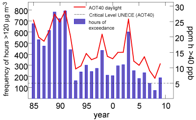 | The ozone concentrations in Schönenbuch have decreased during the nineties but have increased again since. The figure presents the exceedance of the Swiss air quality limit (120 mg/m3 during one hour, blue bars) and of the UN/ECE critical level for the forest (5ppm h >40 ppb, red line). | ||