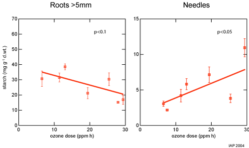 The ozone load is clearly higher than the critical level of 5 ppm h > 40 ppb for the forest. Consequences for the trees are visible injuries, an reduced growth and an impaired carbon allocation to the roots. |