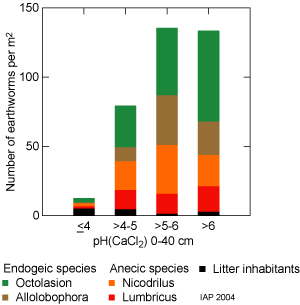 | Below soil pH values of 4 almost no earthworms were found. This holds true especially for the endogeic and the anecic species which are important for soil structure. | |