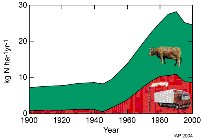 considerably. Green: NH3-nitrogen (emitted by agriculture), red: NOx-nitrogen