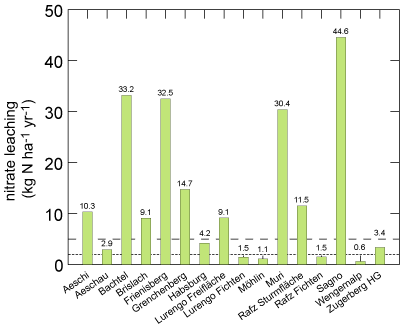 | Leaching of nitrate to the ground water serves as an indicator for nitrogen saturation of an ecosystem. Forest ecosystems are regarded as nitrogen saturated when more than 4-5 kg nitrogen in the lowlands and more than 1-2 kg nitrogen per hectare and year in the mountains is leached from the soil. In plots of the Swiss Plateau, leaching rates between 11 and 33 kg, in the Prealps between 7 and 25 kg and in southern Ticino even 54 kg nitrogen per hectare and year are measured. | |