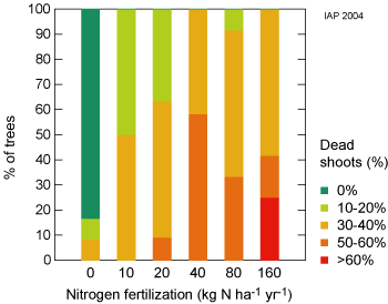 | In 78% of the forest observation plots the nitrogen deposition is higher than the Critical Load of 10-20 kg nitrogen per hectare and year (see also the deposition map on the web site of the Swiss Federal Office of Environment and deposition measurements in the LWF observation plots). | |